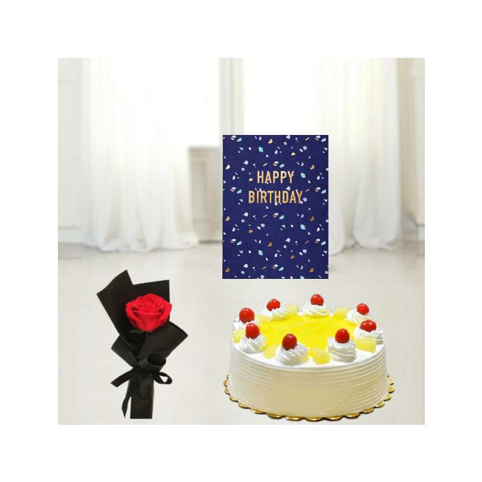 Half kg pineapple cool cake, single red rose, birthday card