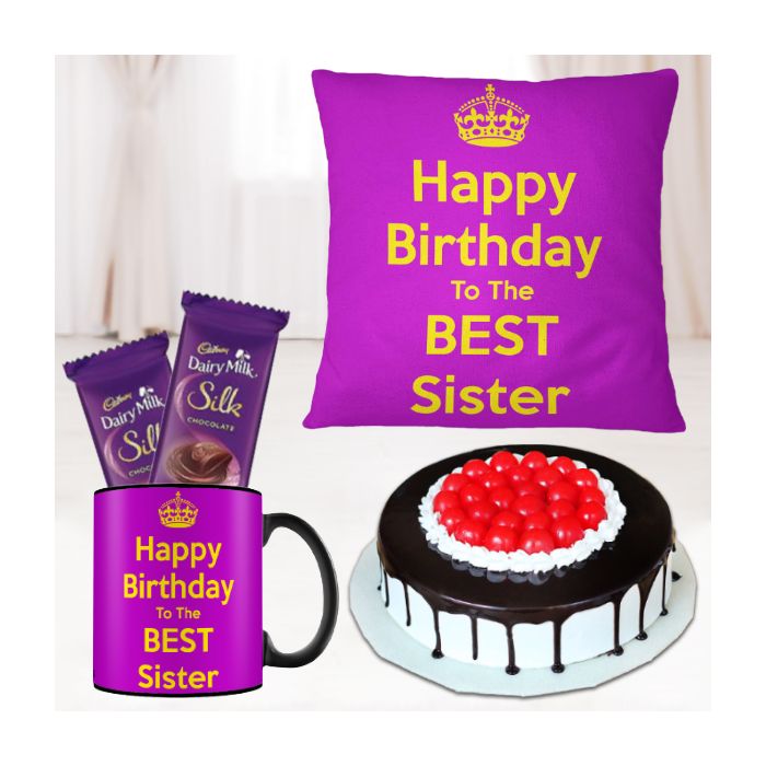 Welcome to our online store! Our Half kg premium quality black forest cool cake, photo mug, set of 2 dairy milk silk with photo cushion is the perfect gift for any occasion. With its delicious chocolate flavor and moist texture, this cake is sure to delight anyone who receives it. The beautiful design on the mug and cushion will make anyone feel special.This gift set is also a great way to show your loved ones how much you care. Order yours today!