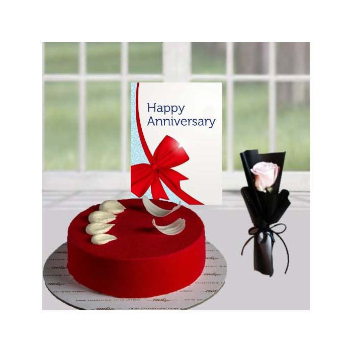 Looking for a delicious and special way to celebrate your anniversary? Look no further than this Half kg red velvet cake, single white rose anniversary Greeting card! This scrumptious cake is made with red velvet cake mix, layered with rich cream cheese frosting and topped with a single white rose. It's the perfect way to show your loved one how much you care!