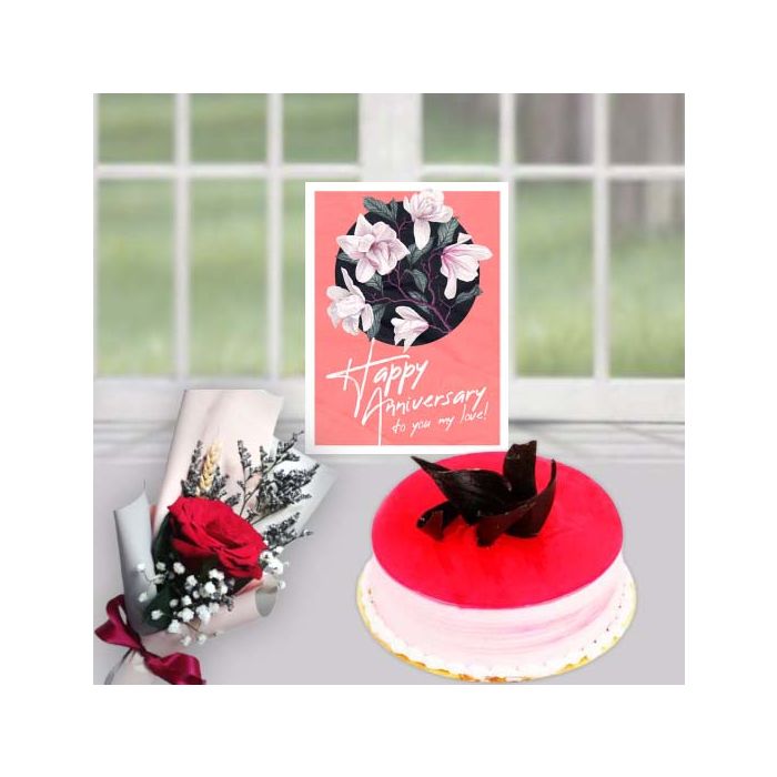 How do you make an anniversary even sweeter? With a delicious Half Kg Strawberry Cool Cake, anniversary card, and single red rose flower from our shop. Your anniversary is a special day to celebrate your love and we want to help make it even sweeter. Our Half Kg Strawberry Cool Cake is the perfect way to show your loved one how much you care. Made with fresh strawberries and cream, this cake is light, fluffy, and absolutely delicious. Plus, it comes with an adorable anniversary card and a single red rose flower. This cake is the perfect way to show your loved one how much you care on your special day. Order your cake today and make this anniversary one to remember!