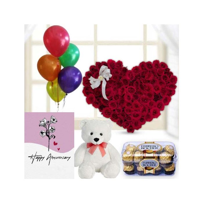 Heart shape arrangement of 100 red roses, 1 feet height teddybear , 16 pcs rocher ferrero chocolates, anniversary Greeting card with 5 blown balloons
