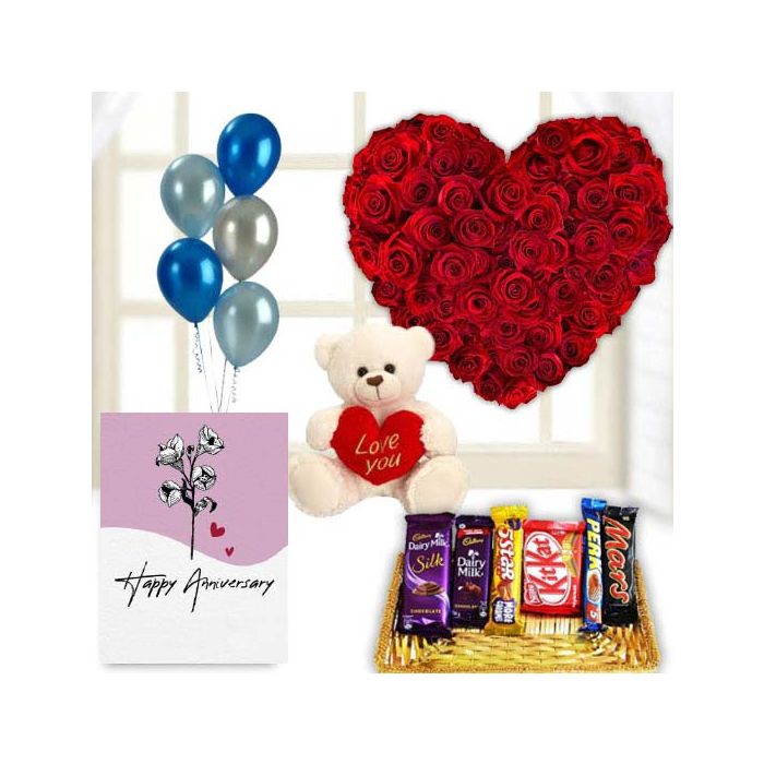 Heart shape arrangement of 30 red roses, 6 inch white teddybear, basket of assorted chocolates, anniversary Greeting card with 5 mix blown balloons