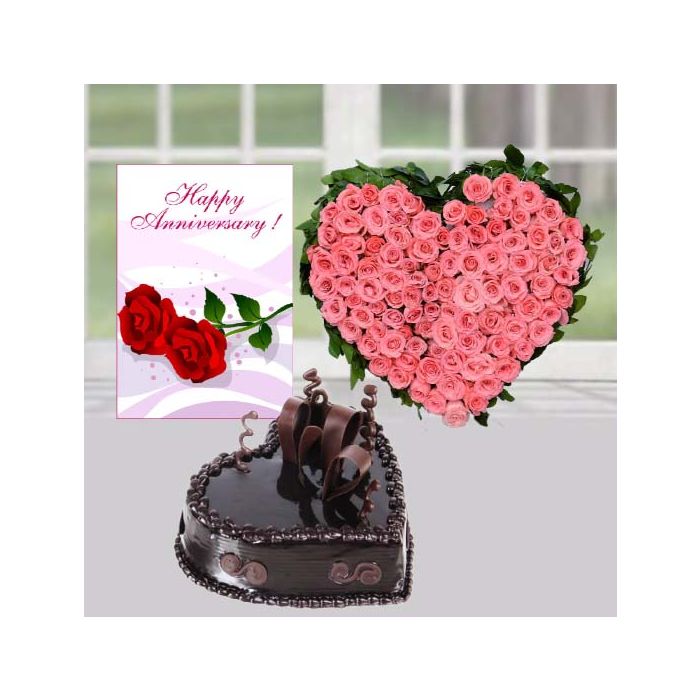 Heart shape arrangement of 40 pink roses, heart shape double chocolate cake, anniversary greeting card