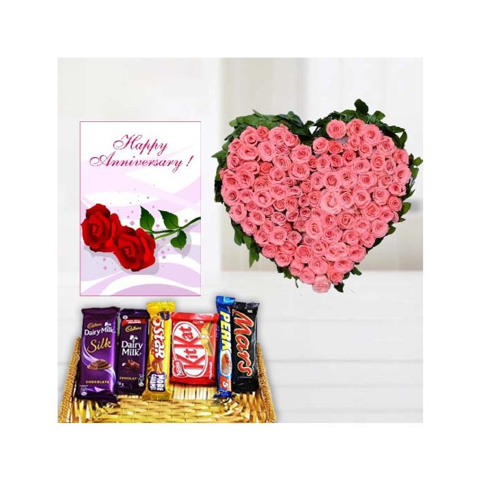 Heart shape arrangement of 50 pink roses, basket of assorted chocolates , anniversary Greeting card