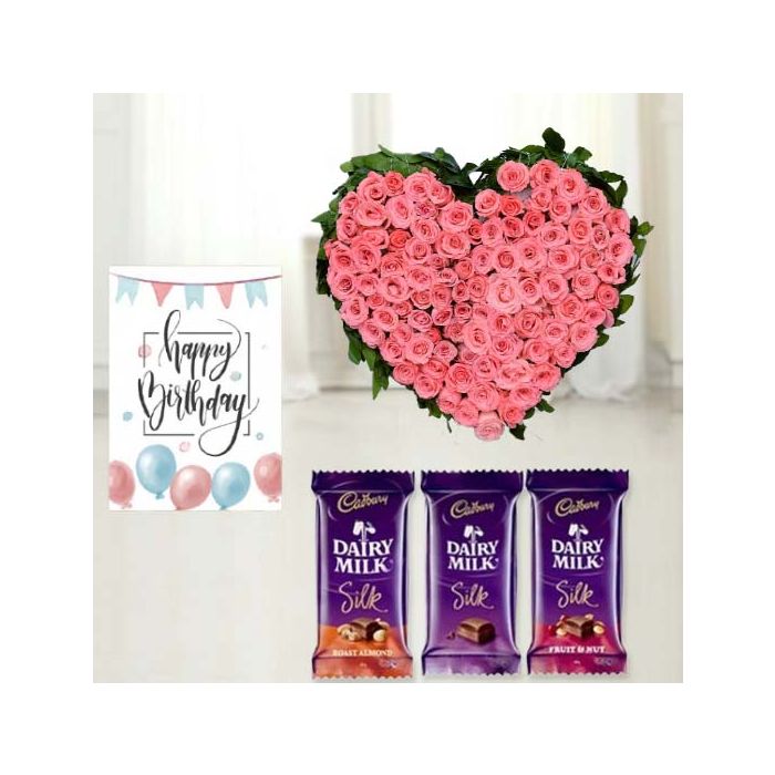 Looking for a way to make someone's day? Why not send them a heart shape arrangement of 50 pink roses? This beautiful bouquet is the perfect way to show someone you care. Adding a set of 3 dairy milk silk chocolates and a birthday greeting card makes this gift even more special.