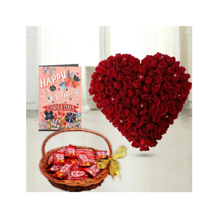 Heart shape arrangement of 50 red roses, Basket of 20 kitkat chocolates , birthday greeting card