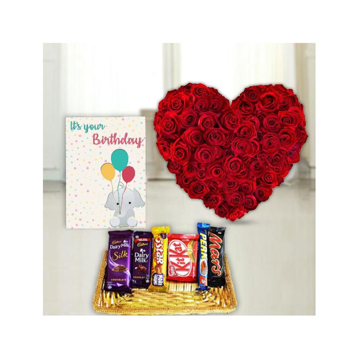 Heart shape arrangement of 50 red roses, basket of assorted chocolates, birthday greeting card