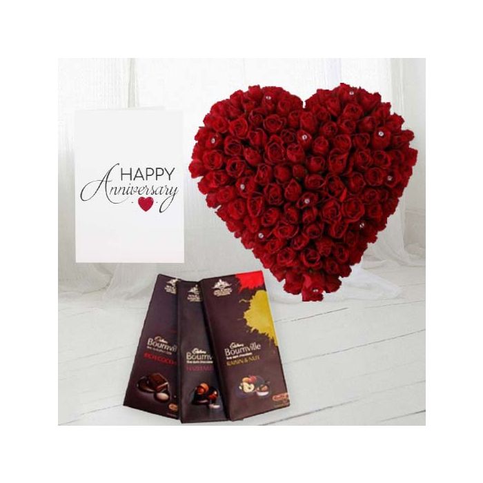 Heart shape arrangement of 50 red roses, set of 3 bournville chocolates , anniversary greeting card