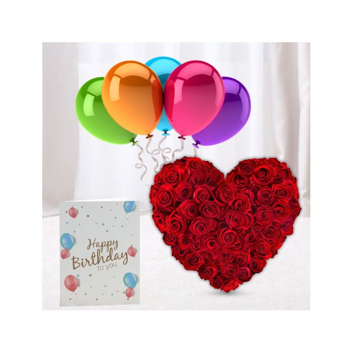 heart shape basket arrangement of red roses ,bunch of 5 mix color balloons with birthday card