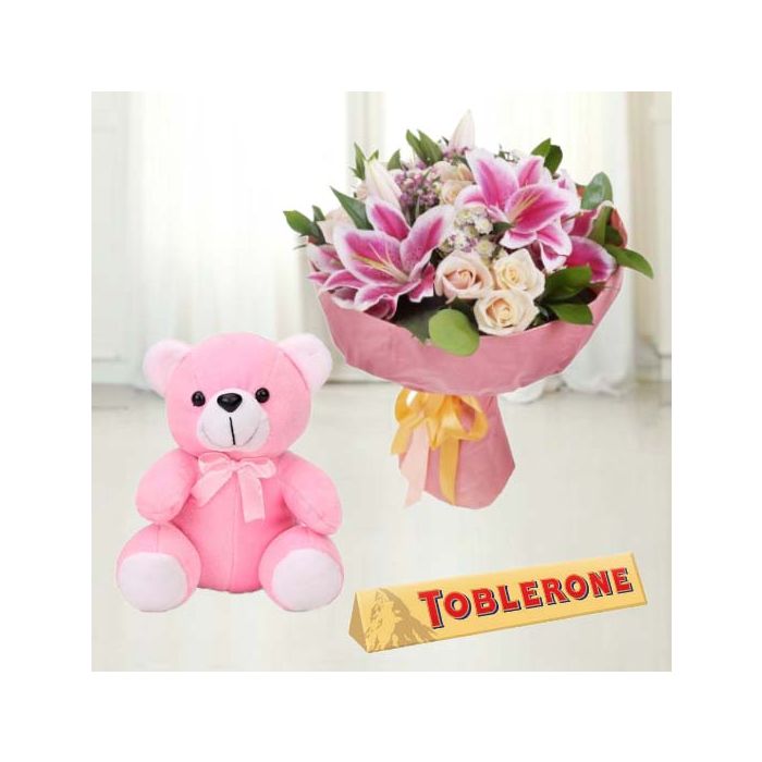 mix flowers bouquet with 6 inch pink teddy bear & toblerone chocolate