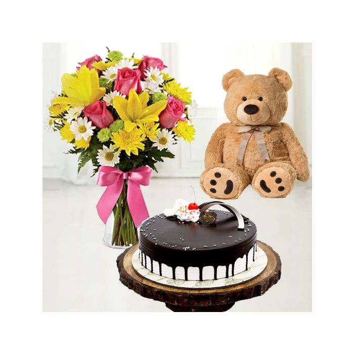 mix flowers in glass vase with choco vanilla cool cake with 6 inch teddybear