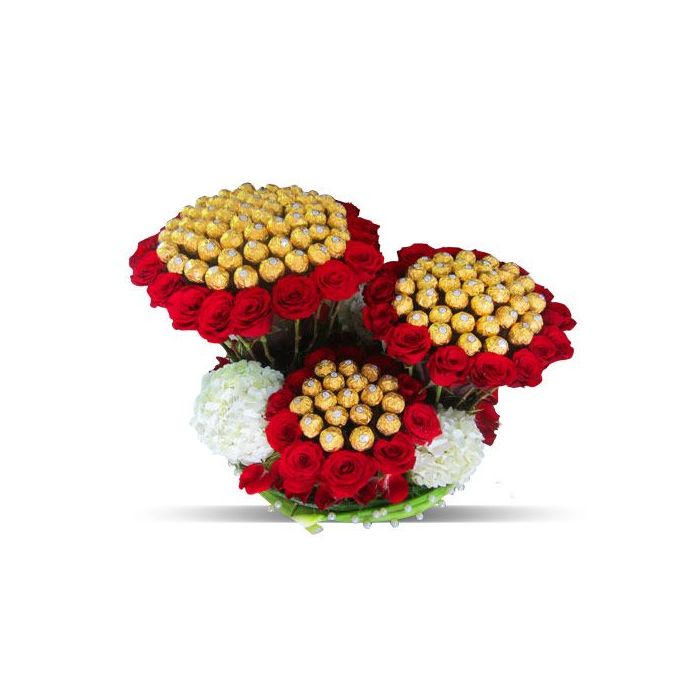 Overloaded with love, this beautiful designer arrangement of 60 red roses and white carnations is the perfect way to show your affection. The luxurious blend of red and white flowers is accented with greenery and comes in a stylish glass vase. 100 pcs total.
