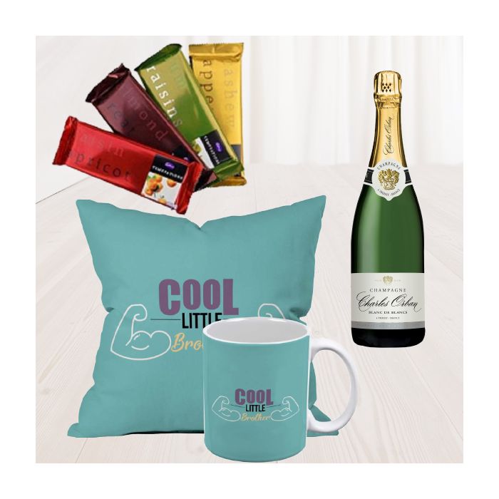 Photo mug with photo cushion, set of 4 temptations chocolate, bottle of champagne