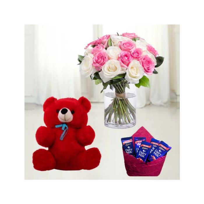 Pink and white roses in glass vase with 6 inch red teddybear with pack of 5 dairy milk chocolates