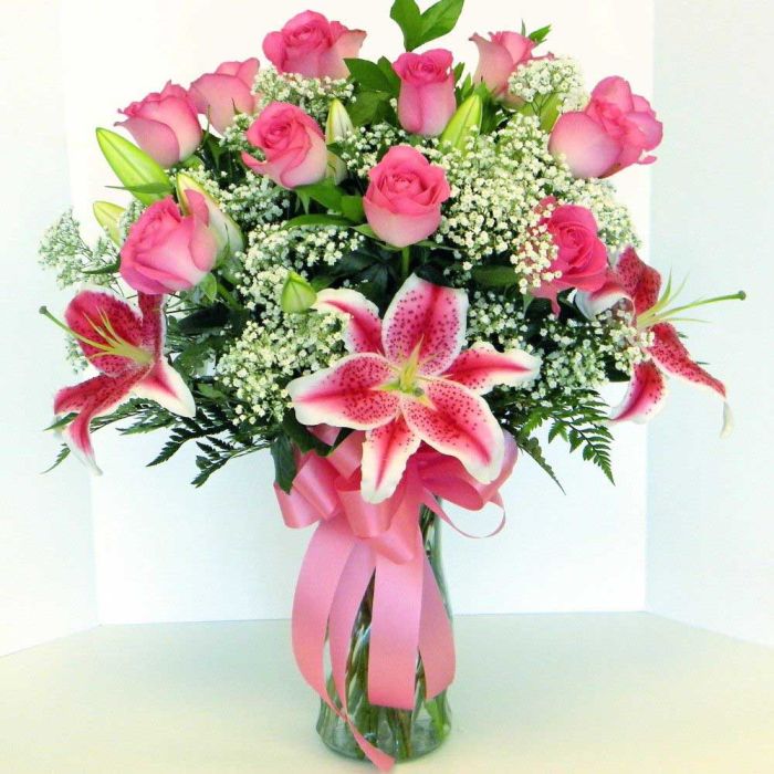 Looking for a way to show your mom how much you care this Mother's Day? Look no further than this gorgeous arrangement of pink lilies and roses. Arranged in a beautiful vase, this gift is sure to brighten her day and let her know just how much you love her.