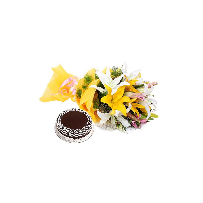 Looking for a unique and thoughtful gift? Look no further than our Bunch of 10 lilies with 1 pound chocolate cake! This beautiful arrangement of lilies is accented with a delicious chocolate cake, making it the perfect present for any occasion.The recipient will be sure to appreciate the thoughtfulness of this gift, and the lilies will add a touch of elegance to any room. With its lovely fragrance and stunning colors, the Bunch of 10 lilies is sure to make a lasting impression. Order today and make someone's day!