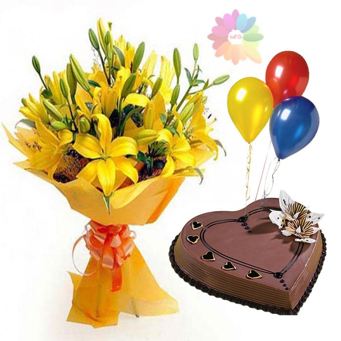 Looking for a way to show your special someone how much you care? Look no further than this beautiful bunch of yellow lilies, complete with a heart-shaped butterscotch cake and three balloons. The lilies are a symbol of love and devotion, while the cake is a delicious way to show your affection. This gift is sure to put a smile on your loved one's face.