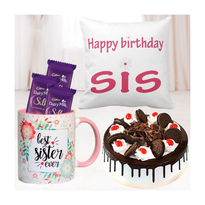 Presenting the perfect gift for every chocolate lover in your life - a set of photo cushion and photo mug, 3 dairy milk silk with half kg oreo black forest cake! This gift set comes complete with everything they need to enjoy their favorite chocolate flavor, including 3 dairy milk silk and half kg oreo black forest cake. The photo cushion and mug make it extra special by allowing them to display their sweet moments with friends and family. So go ahead and indulge your loved ones with this delicious gift today!