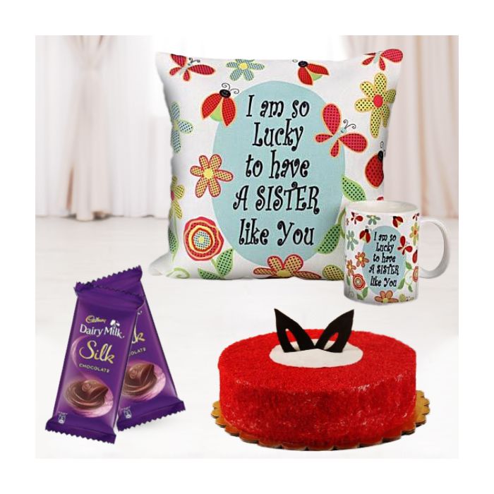 Looking for the perfect gift for a loved one? Look no further than this stunning set of photo cushion and photo mug, half kg red velvet cake, with 2 dairy milk silk chocolates. The cushion and mug are both personalised with a special photo, making them a truly unique and thoughtful gift. The red velvet cake is delicious and decadent, sure to please any sweet tooth. And what could be better than enjoying it all with a cup of tea or coffee, made even more special with the addition of two dairy milk silk chocolates. Order now and make someone's day!