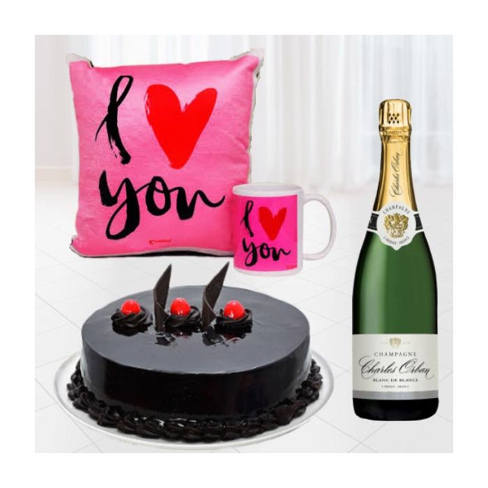 set of photo cushion with photo mug , half kg chocolate truffle cake with bottle of champagne
