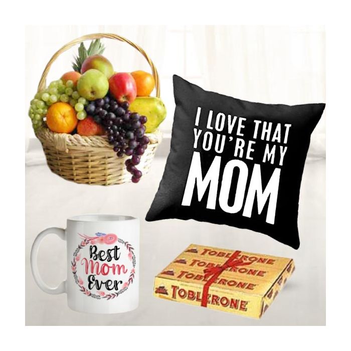 Set of photo mug and photo cushion with 3 kg mix fruit basket with 3 toblerone chocolate