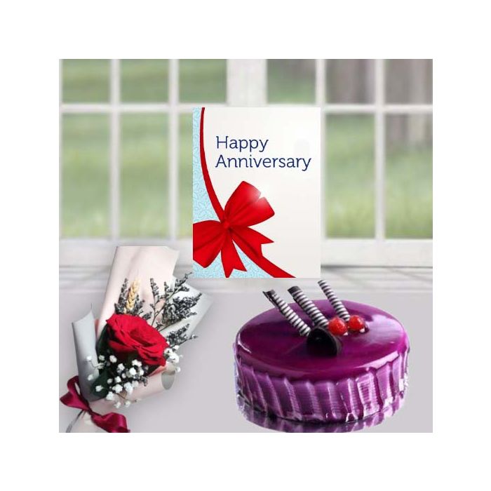 A single red rose flower is the perfect way to show your love and affection on this special day. Half kg black currant cake and an anniversary card are also included to make this gift extra special. The cake is freshly baked and is perfect for sharing. The card is beautifully designed and will surely make your loved one's day even more memorable.