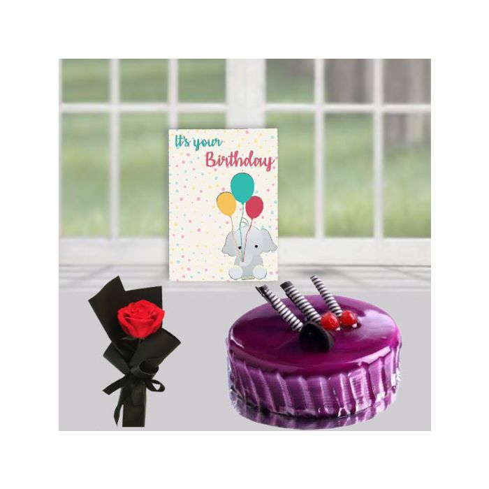 Looking for a gift that is both romantic and delicious? Look no further than our Single Red Rose and Half Kg Black Currant Cake! This cake is made with fresh, plump blackcurrants and topped with a red rose, making it the perfect way to show your beloved how much you care. The Birthday Card is the perfect addition to this scrumptious surprise, with a personal message inside that will make them feel loved and appreciated.
