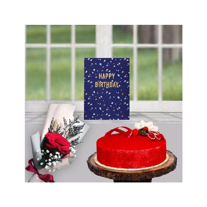 Single red rose flower, half kg red velvet cake, birthday greeting card