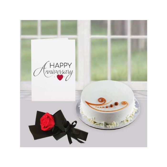 Looking for a special way to show your love and affection on your anniversary? Look no further than our stunning red rose, half kg vanilla cool cake, and anniversary card combo! The beautiful red rose is the perfect symbol of your love, while the delicious cake and card will let your partner know just how much you care. This combo is sure to make your anniversary one to remember!