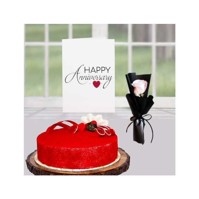 This Anniversary, let your loved one know how much they mean to you with a beautiful present that celebrates both your love and your years together. Our Single red rose flower, half kg white velvet cake, and anniversary greeting card are the perfect way to show them how much you care. The Single red rose is a classic symbol of love and appreciation, while the half kg white velvet cake is a delicious and elegant way to show your affection. The anniversary greeting card is the perfect finishing touch, allowing you to personalize your message and express your feelings in your own words. This complete package is sure to make this a memorable anniversary for years to come.