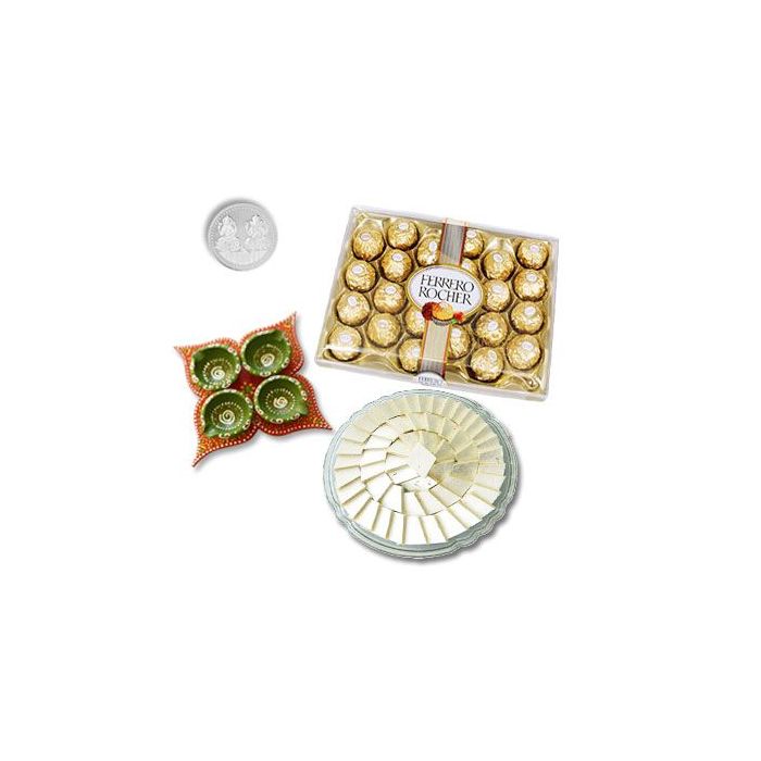 A complete combo to celebrate this diwali with Half kg kaju burfi, 16 pcs ferrero rocher chocolates and 4 traditional dias.