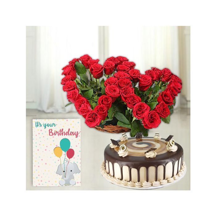 Looking for a unique and special gift for your loved one's birthday? Look no further than this gorgeous arrangement of 30 red roses in a twin heart shape, with an irish coffee cake and a birthday greeting card. This stunning gift is sure to make a lasting impression and show your loved one just how much you care. Order today and let us help you make their birthday unforgettable.