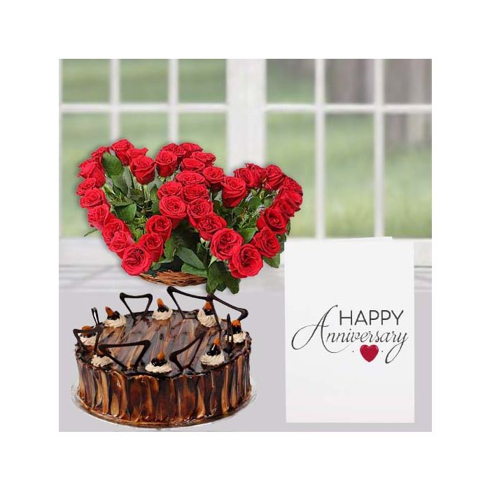 This stunning arrangement of 30 red roses in a twin heart shape is the perfect way to show your loved ones how much you care on your anniversary. The Irish coffee cake is a delicious and special treat that will add an extra touch of sweetness to the occasion. The card included with the arrangement expresses your love and gratitude perfectly. This is a truly thoughtful and romantic gift that will be cherished forever.