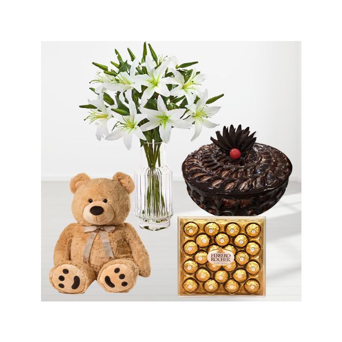 Vase arrangement of 10 white lilies, chocolate fudge cake, 24 pcs rocher ferrero chocolates with 1 feet height teddybear