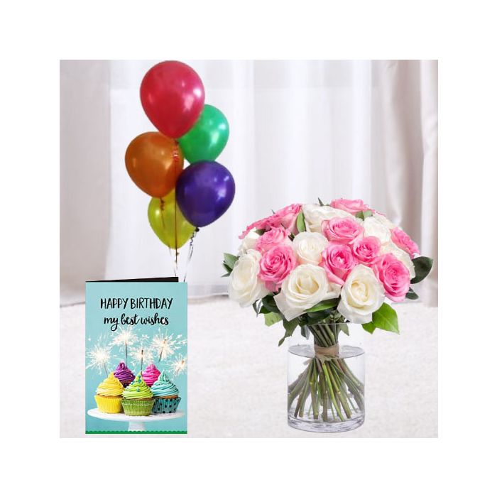 vase arrangement of 12 pink and white roses, 5 bunch of mix color balloons with birthday cards