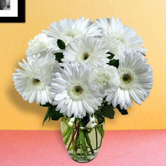 Looking for a timeless gift that will show your loved ones how much you care? Look no further than our vase arrangement of 12 white gerbera! This beautiful arrangement is perfect for any occasions and is sure to make a lasting impression.The gerbera daisies are known for their purity and innocence, making them the perfect way to show your loved ones how much you care. Arranged in a stylish glass vase, this arrangement is easy to care for and will look gorgeous in any room. Whether you're looking for a gift for a special occasion or just want to show someone how much you care, this arrangement is sure to please.