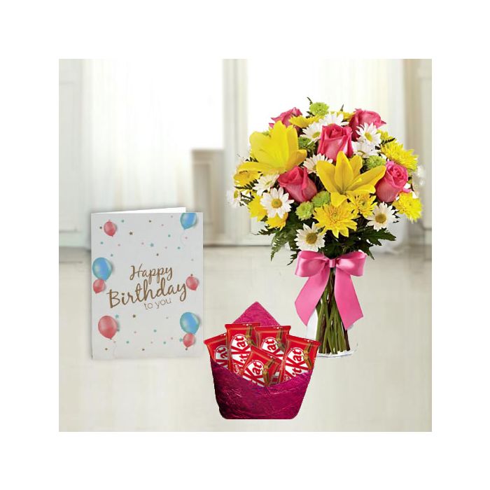 Vase arrangement of 15 mix flowers , pack of 5 kitkat chocolates, birthday Greeting card
