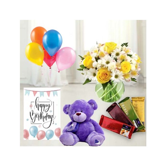 Vase arrangement of 15 roses and daisies, 6 inch teddybear , set of 4 temptations chocolates, birthday greeting card with 5 blown balloons