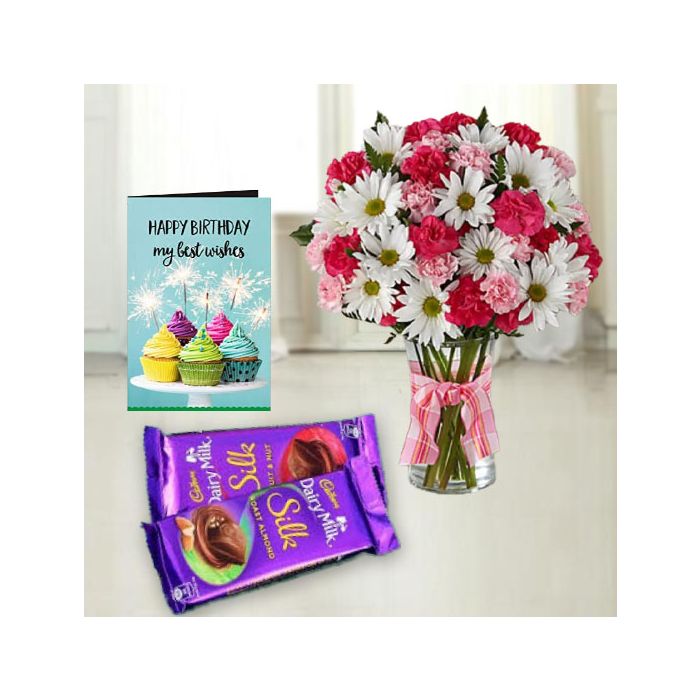 Vase arrangement of 20 mix flowers, set of 2 dairy milk silk chocolates, birthday greeting card