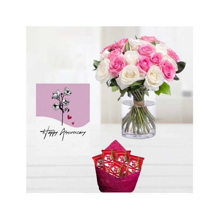 Vase Arrangement of 20 pink and white roses ,pack of 5 kitkat chocolates, anniversary greeting card
