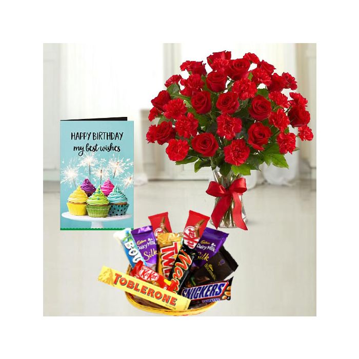Vase arrangement of 20 red roses with red carnations, basket of premium assorted chocolates, birthday greeting card
