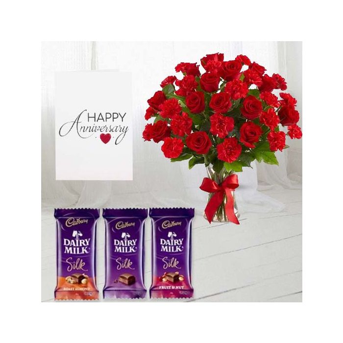 Vase arrangement of 20 red roses with red carnations, set of 3 dairy milk silk chocolates, anniversary greeting card