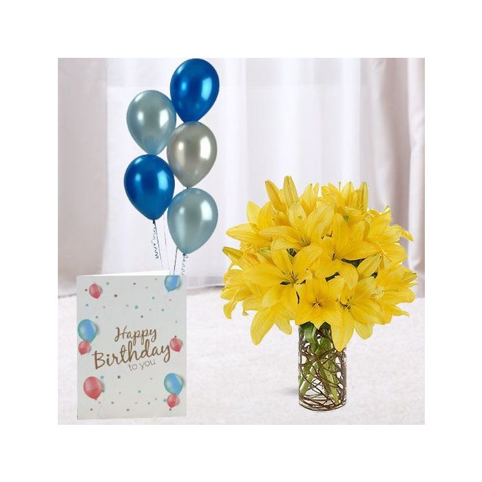 Looking for a beautiful and unique way to show someone you care? Check out our vase arrangement of 5 yellow lilies, 5 bunch of mix color balloon with birthday card! This one-of-a-kind gift is perfect for any occasion, and is sure to put a smile on the recipient's face.