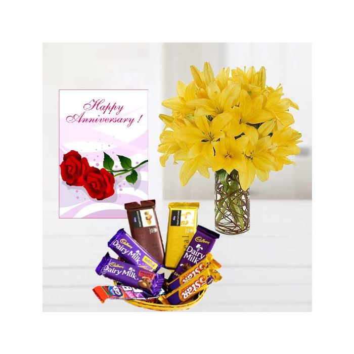Celebrate your anniversary with a beautiful vase arrangement of 5 yellow lilies. This vibrant and fragrant bouquet is the perfect way to show your loved one how much you care. Accompanied by a basket of delicious assorted chocolates, this gift is sure to make your anniversary unforgettable.