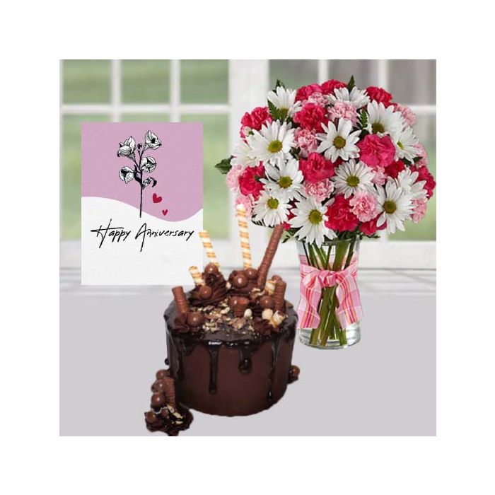 Vase arrangement of exotic mix flowers, chocolate explosion cake, anniversary greeting card