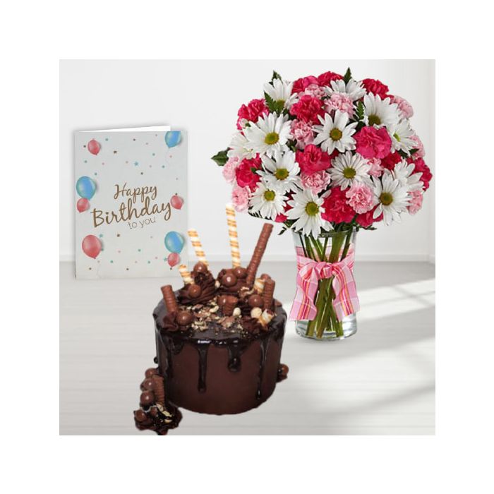 Vase arrangement of exotic mix flowers, chocolate explosion cake, birthday greeting card