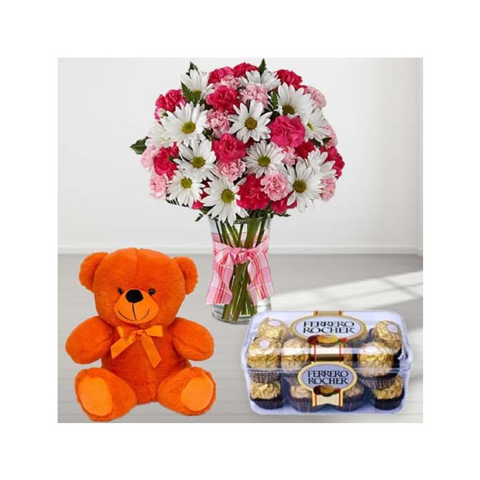 Vase arrangement of Mixed flowers with 6 inch teddy bear & 16 pcs ferrero rocher chocolate