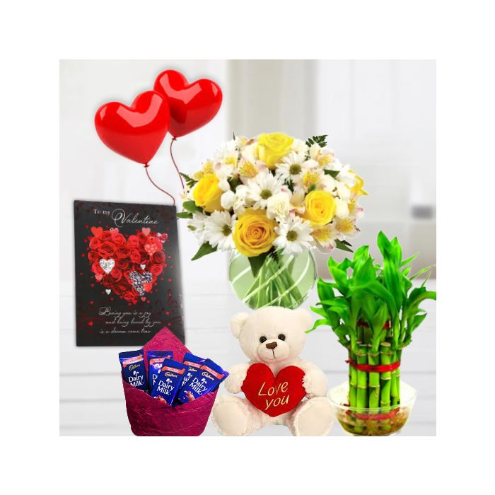 Vase arrangement of roses and daisies, pack of 5 fivestar, 6 inch height teddybear, 2 layer Lucky bamboo plant, 5 blown balloons with greeting card