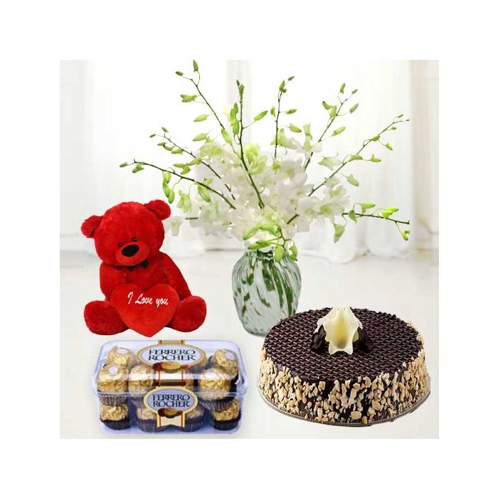 white orchids in glass vase with chocolate almond cake with 6 inch teddybear with 16 pcs rocher ferrero chocolates